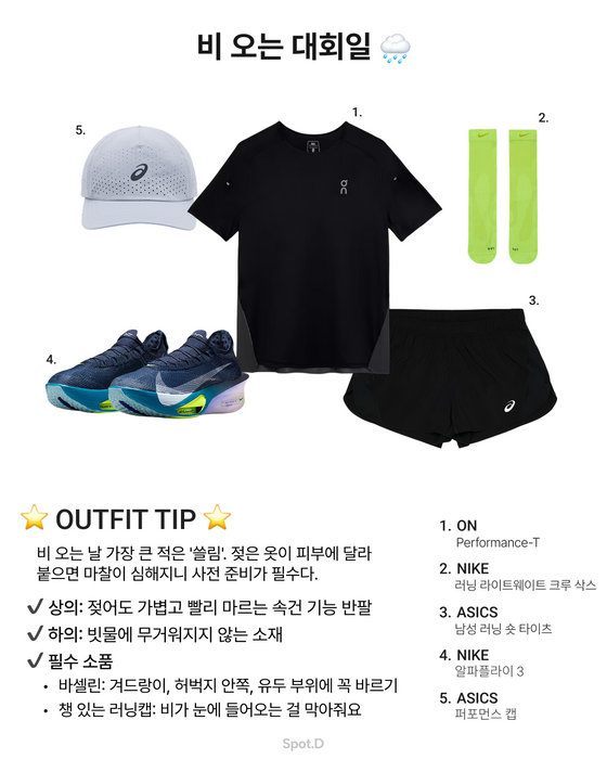 평소 러닝과 다르게 대회는 한 번 출발하면 중간에 옷을 바꿀 수 없기 때문에, 복장 선택이 곧 컨디션이에요. Spot.D가 봄(3~5월) 마라톤 대회에 바로 쓸 수 있는 기온별·상황별 복장 가이드를 준비했습니다.