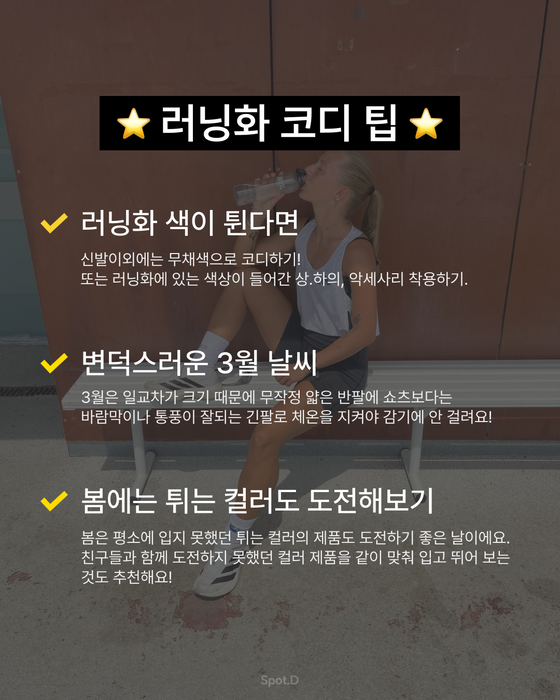 스팟디가 대신 조합해 봤으니, 마음에 드는 코디 골라서 러닝하기 좋은 3월을 즐기셨으면 좋겠습니다!