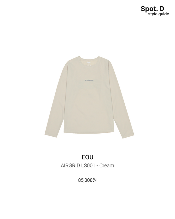 미니멀한 크림 컬러 롱슬리브. 에어그리드 소재로 통기성을 확보하면서도 이른 아침 쌀쌀한 공기를 막아주는 간절기 필수 상의.